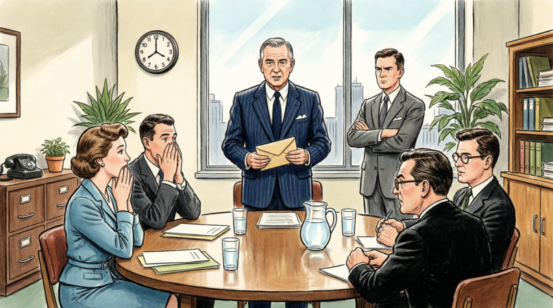 Mitchell looked down at his papers, then carefully, deliberately looked toward the man in the corner. The man in the corner set his envelope on the table. He adjusted his glasses, and then he stood up.